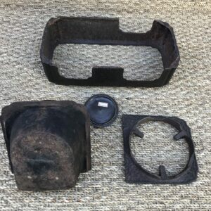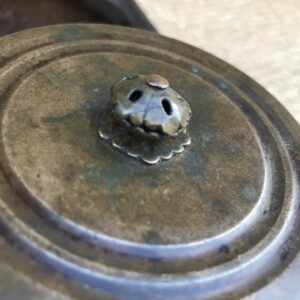 Présence d’un cartouche sur le côté ( photo 10) ,avec des inscriptions malheureusement illisibles.Le couvercle est un peu aplati sur 1 ,5 cm suite à une chute probablement (photo 6).