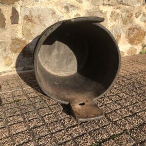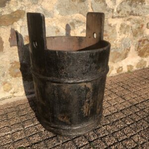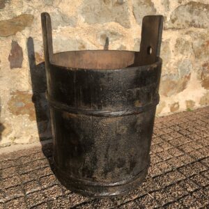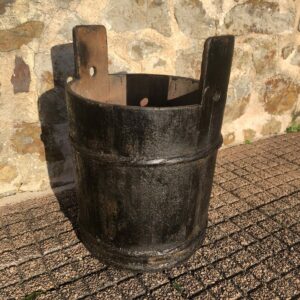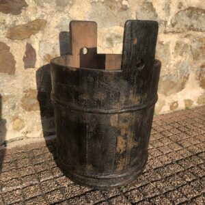 Seau traditionnel Japonais de grande taille (contenance environ 40 litres) . L’extérieur a été anciennement recouvert d’un enduit noir créant une très belle patine . On passait un cordage dans les trous pour le transport. Epoque Meiji .