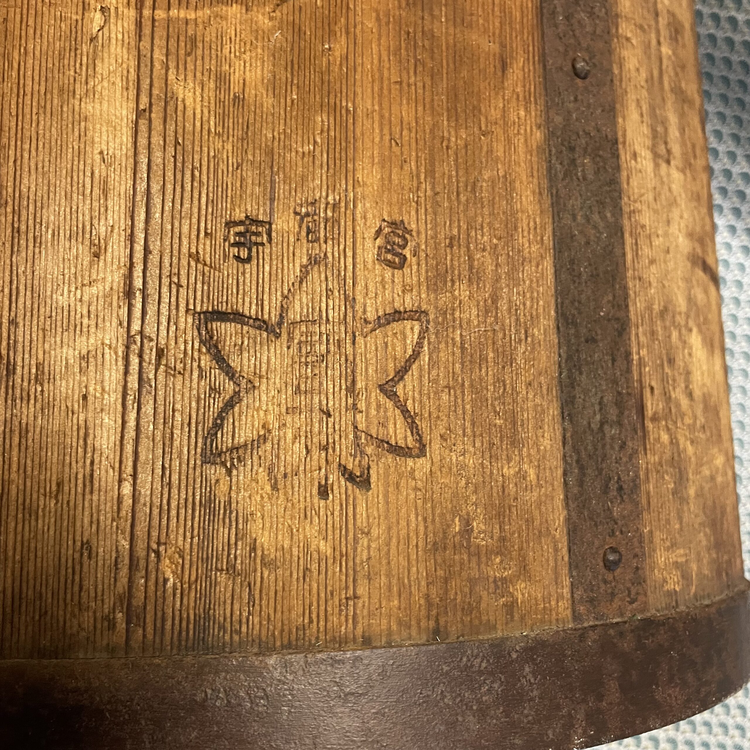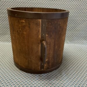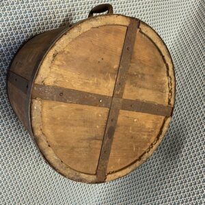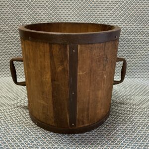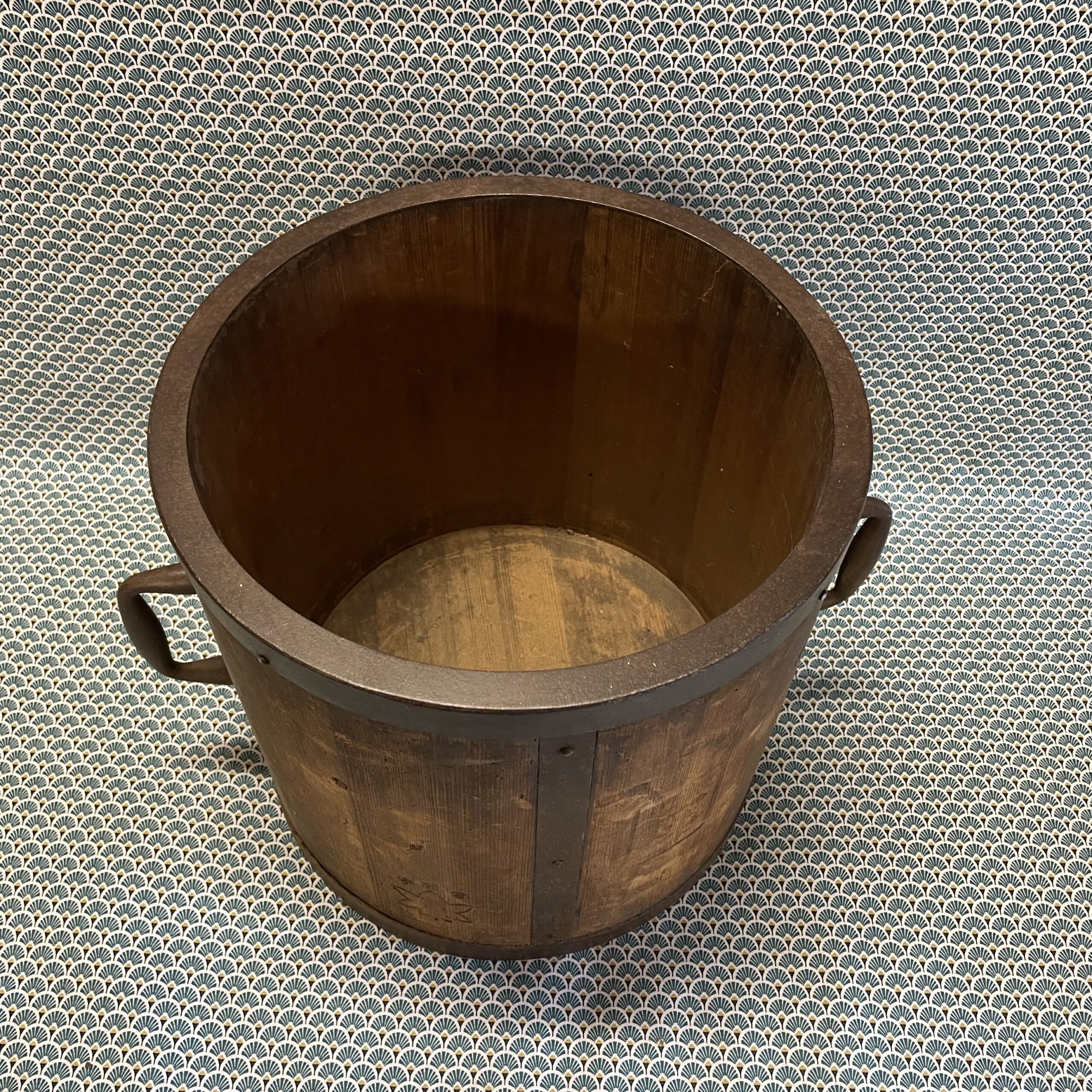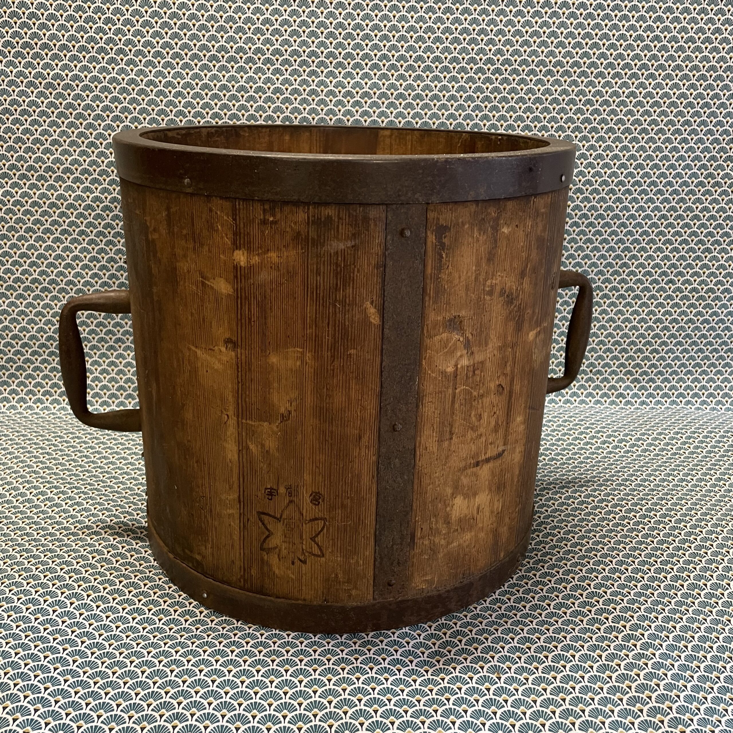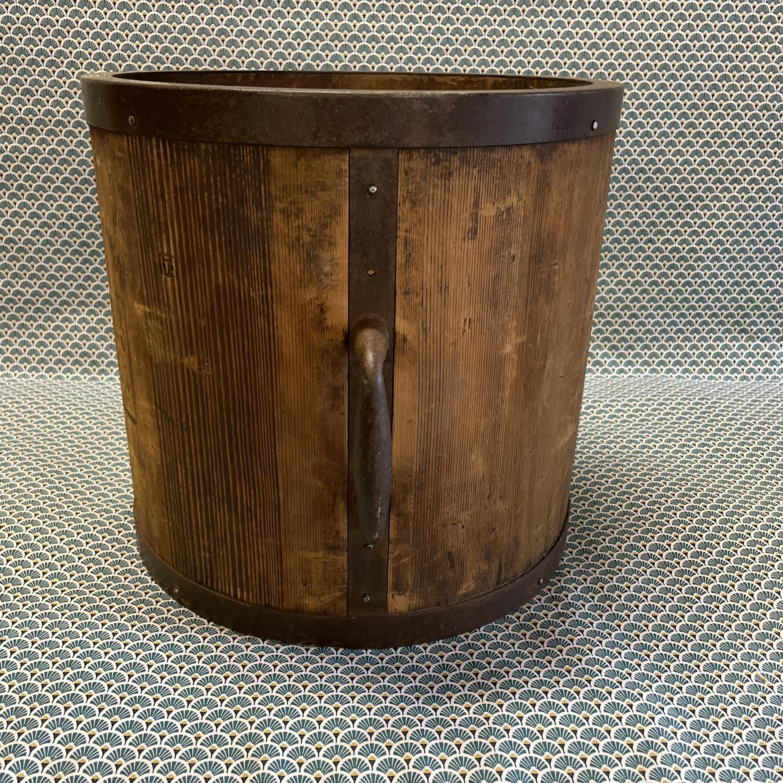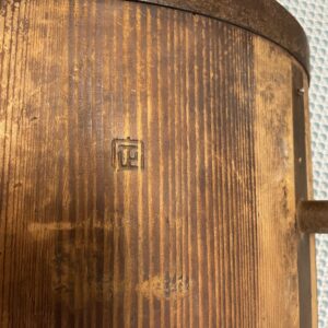 Ancienne mesure à grains et à riz fabriquée comme un tonneau , avec des « douelles » en bois de paulownia (kiri) et cerclage en fer. Marques indiquant la quantité et la destination de l’objet partiellement effacées . La contenance est de 18 litres ,ce qui donne une idée plus précise de la taille de l’objet .