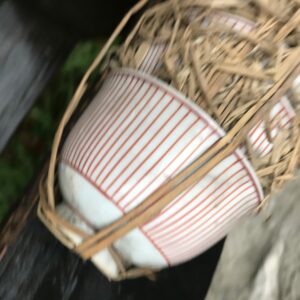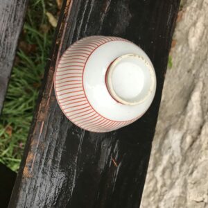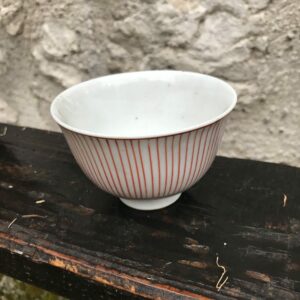Série de 9 bols à thé en porcelaine blanche avec de fines rayures orangées provenant d’un ancien stock des années 70.