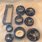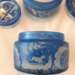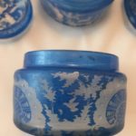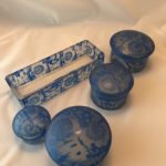 Quatre boites rondes couvertes et un porte-peigne ou brosses à dents rectangulaire. Quelques micro-égrenures sur les rebords de deux boites . 5 égrenures sur l’objet rectangulaire.