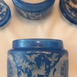 Ensemble de toilette en verre doublé bleu gravé à la roue . Riche décor , d’animaux ( oiseau,chien,lièvre) et châteaux cernés de « coquilles ».Fin XIXème début XXème.