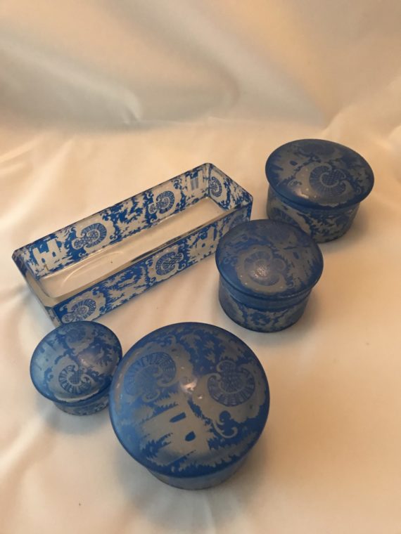 Réference: CV 002 Ensemble de toilette en verre doublé bleu gravé à la roue . Riche décor , d’animaux ( oiseau,chien,lièvre) et châteaux cernés de « coquilles ».Fin XIXème début XXème. Quatre boites rondes couvertes et […]
