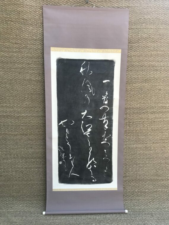Ref : JD 151 Kakejiku ou Kakemono à décor de caractères Japonais blancs sur fond noir. Pliures visibles sur les photos. Dimensions : 199 x 78 cm […]