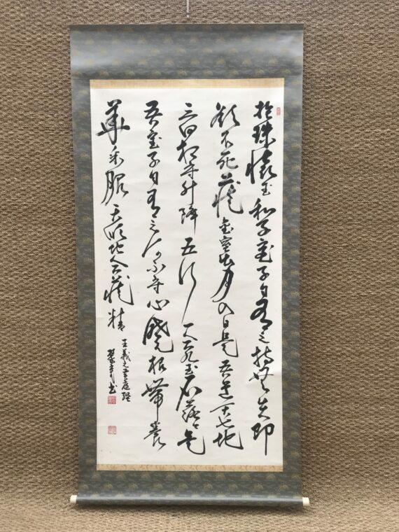 Ref : JD 150 Kakemono ou Kakejiku avec caractères japonais à l’encre noire et cachets à l’encre rouge. Dimensions totales : Hauteur : 169 cm Largeur : 85 cm Prix : 50 Euros Petites taches […]