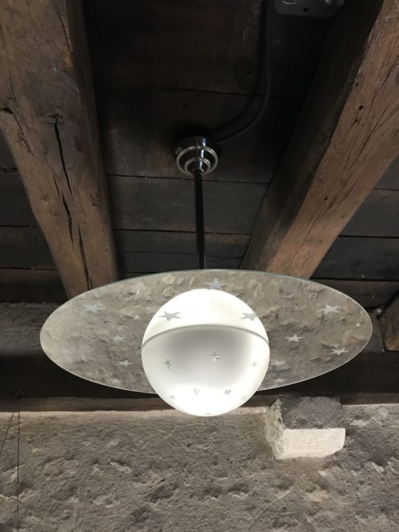 Réference: L 002 Suspension des années 60 ,quand la conquête spatiale fascinait le monde. Globe en verre givré gravé d’étoiles , entouré d’un disque en miroir également recouvert d’étoiles. Tige en métal chromé. Très […]