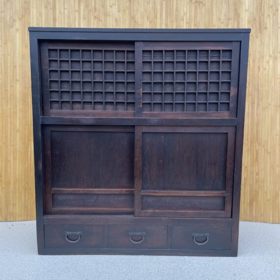 Ref : JM 188 Tansu de faible encombrement en cryptomeria à trois tiroirs et quatre portes coulissantes. Des bandes de papier ont été collées à l’arrière pour masquer l’écartement entre les planches du à l’âge […]