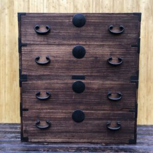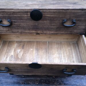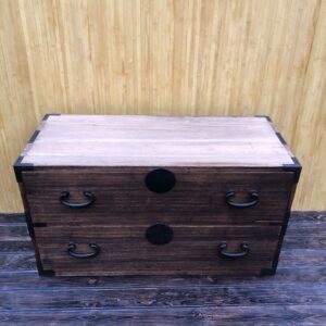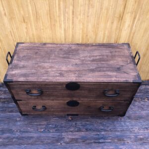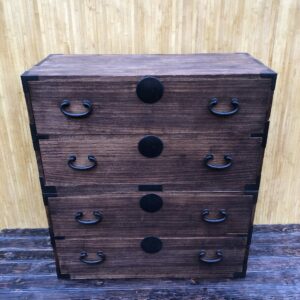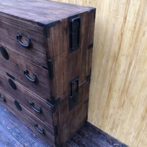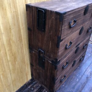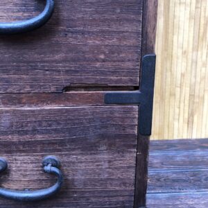 Tansu, commode Japonaise à deux éléments et quatre tiroirs.Poignées de transport servant également à solidariser les deux parties (photo 3 et 4). Dans son jus , un petit manque en bas du deuxième tiroir de la partie inférieure (photo 9).Dessus tâché sur la droite ( photo 7).