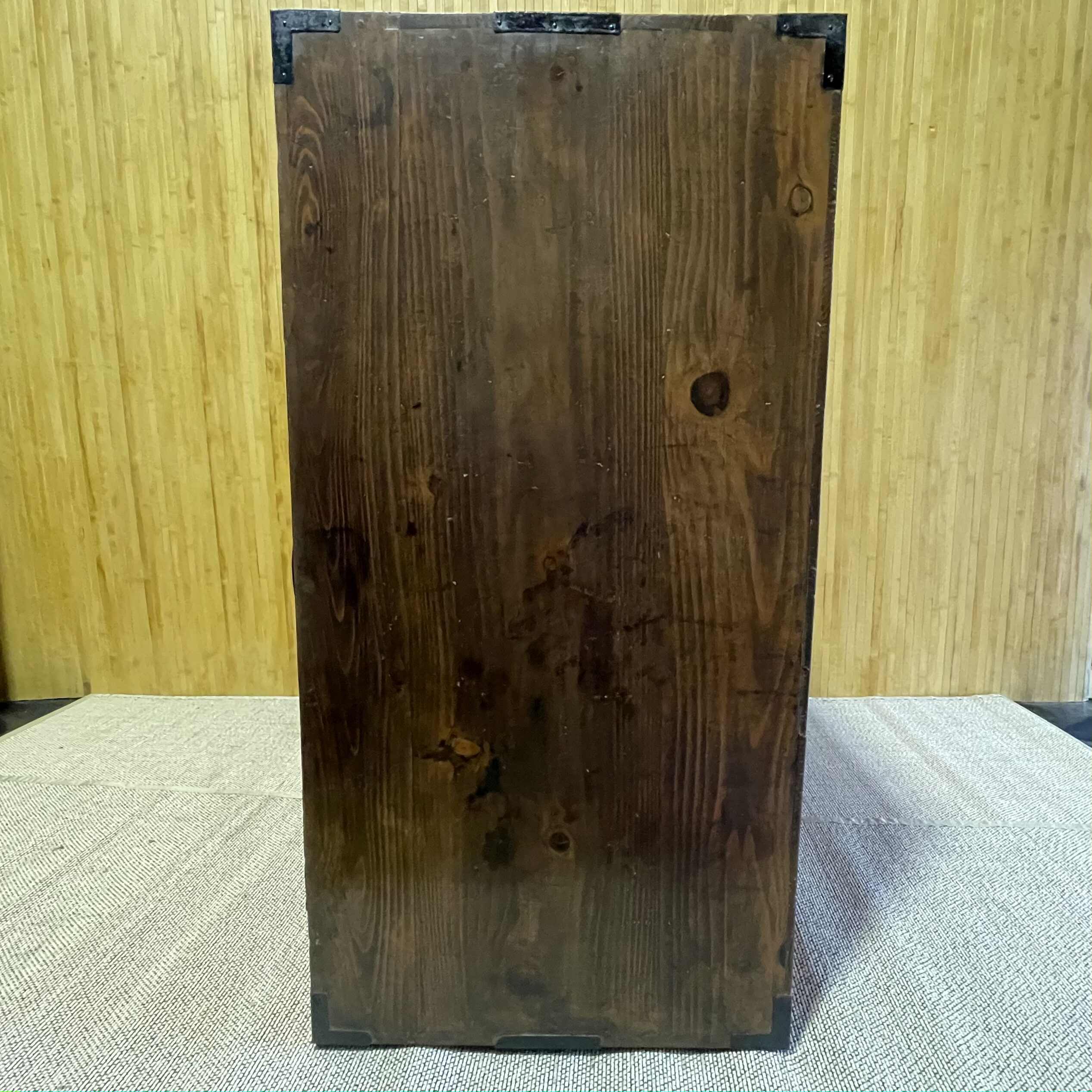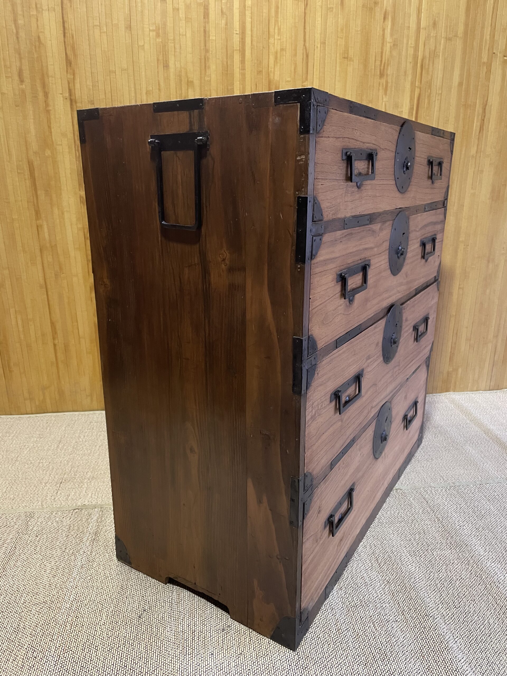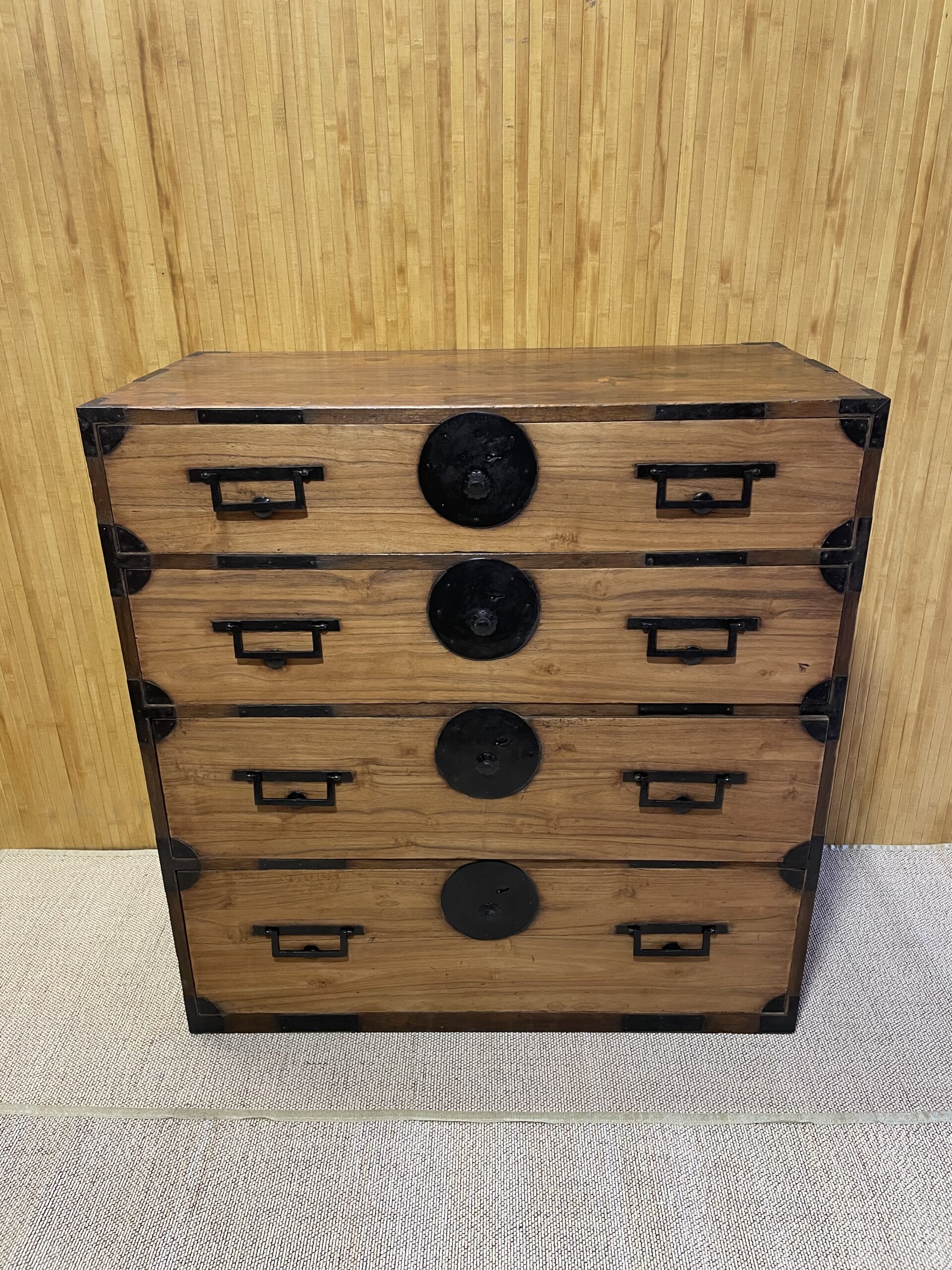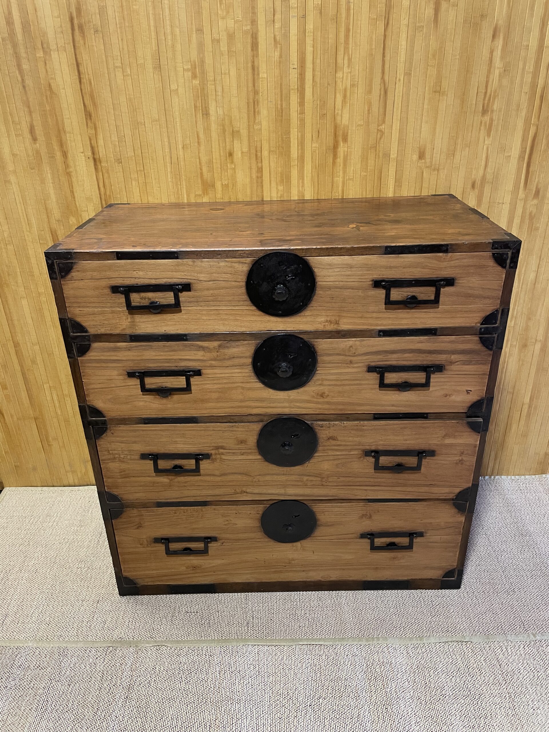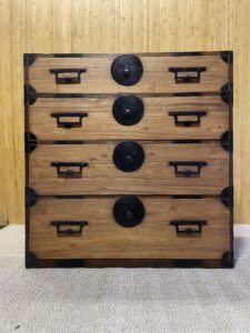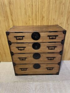 Tansu à quatre tiroirs de hauteurs différentes (14,5 , 17 , 21 et 24 cm). Bâti en cryptomeria (parties plus foncées) et façades des tiroirs en paulownia (plus claires). Très bon état général , toutes les pièces métalliques étaient assez rouillées et ont été repatinées. Dessus du meuble avec quelques taches visibles sur les deux dernières photos.