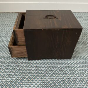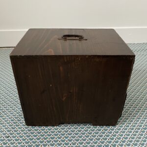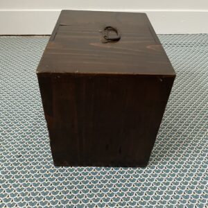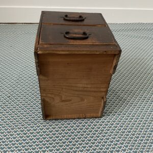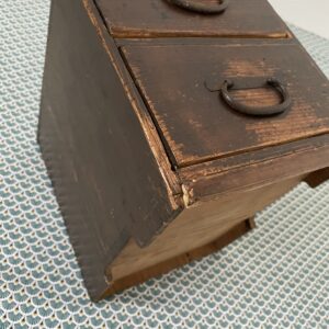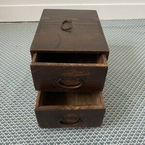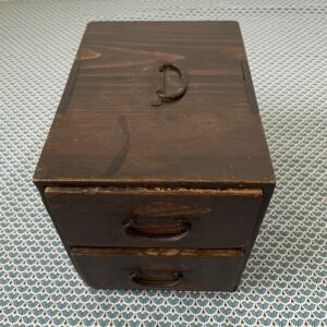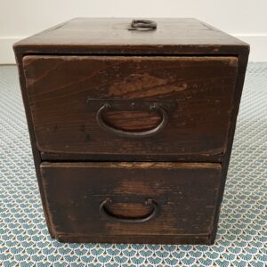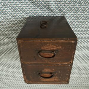 Tout petit meuble de commerçant à deux tiroirs en paulownia (kiri) laqué. Belle patine ancienne avec usures et petit manque au coin inférieur en façade ( voir photo 9). Idéal à utiliser en boîte à bijoux ,à couture ou à secrets… Epoque fin Meiji début Showa.