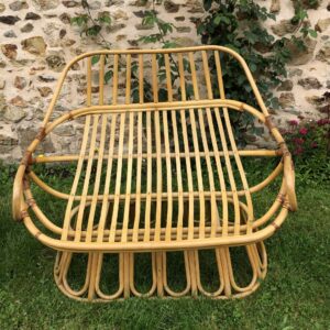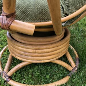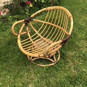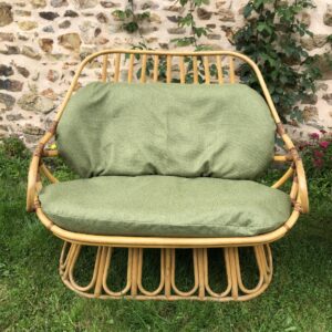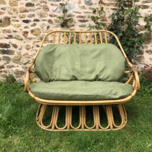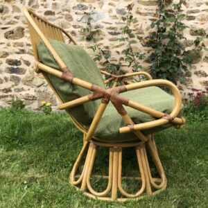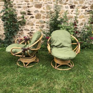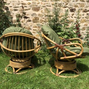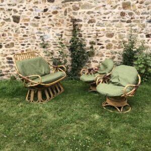Salon en rotin composé d’un canapé fixe et de deux fauteuils pivotants et basculants .