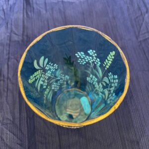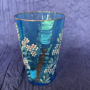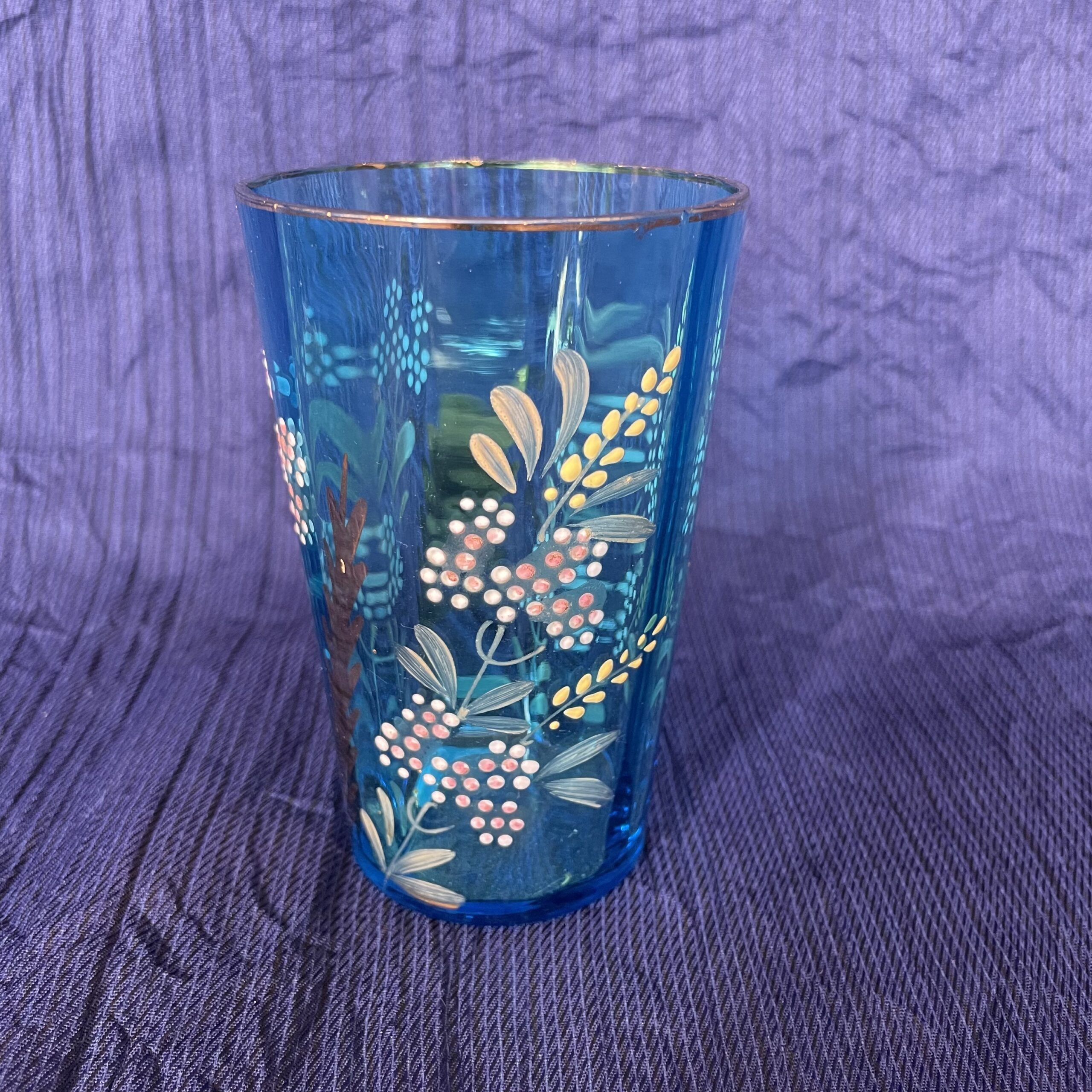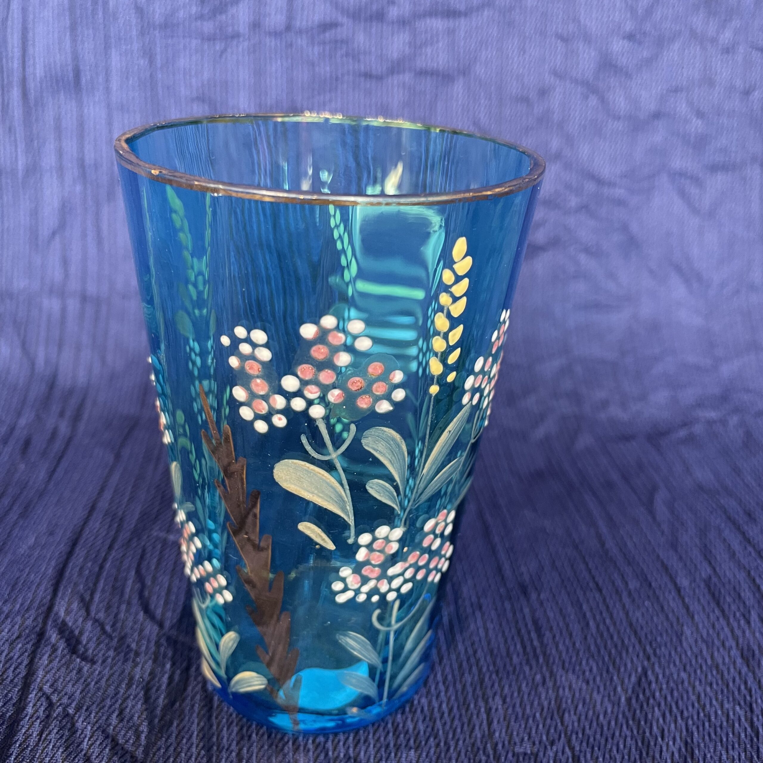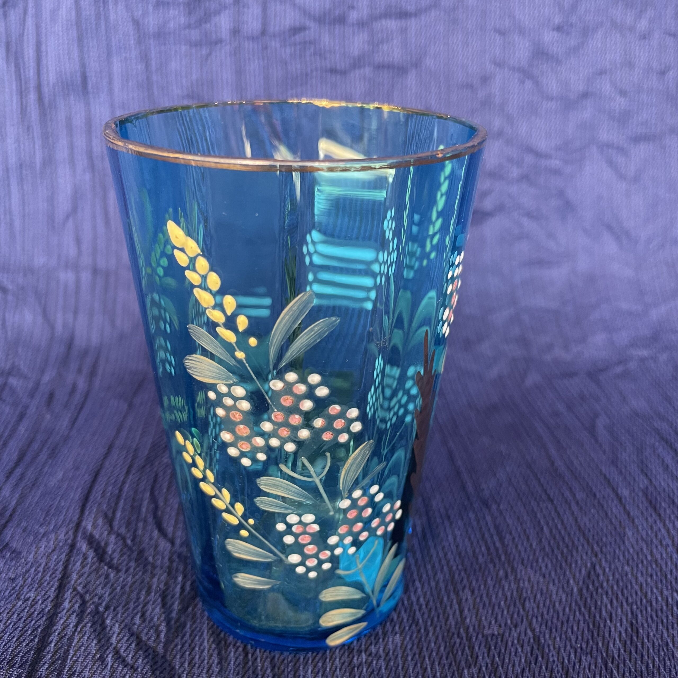 Verre bleu tronconique à décor floral émaillé en relief et deux épis or .