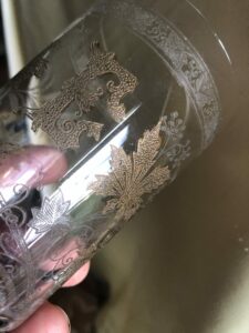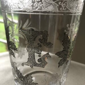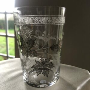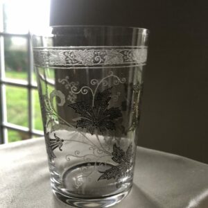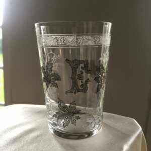 Beau gobelet en cristal chiffré E. Belle gravure à l’acide de branchages et fleurs. Les parties en noir sur les photos sont en fait de la dorure (voir photo 5), également présente sur le bord du verre.