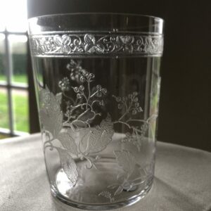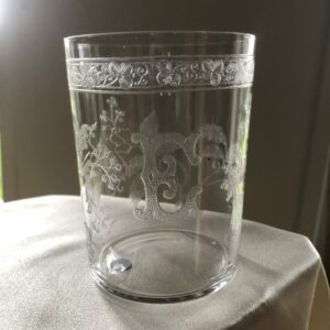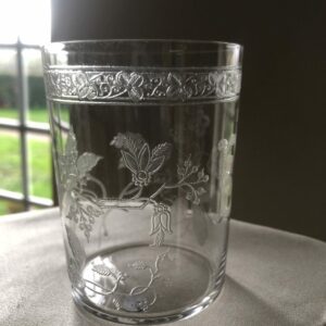 Beau verre en cristal chiffré E . Belle gravure à l’acide occupant tout le verre de fleurs et branchages, frise florale .