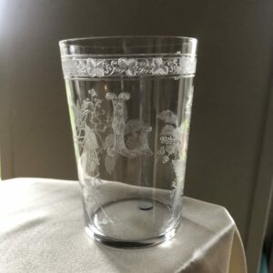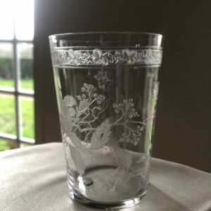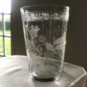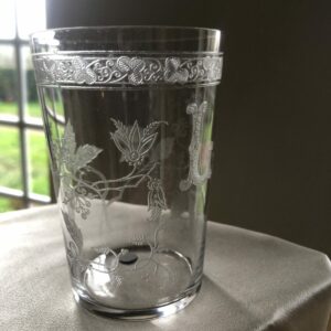 Beau gobelet en cristal chiffré L. Belle gravure à l’acide de branchages et fleurs occupant tout le tour du verre.