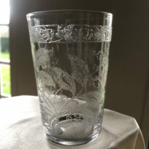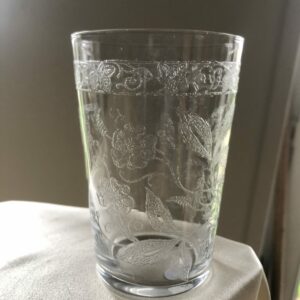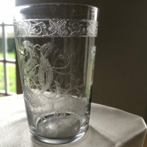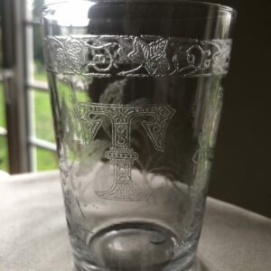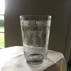 Beau verre gobelet en cristal chiffré T. Belle gravure à l’acide de fleurs et branchages ,frise florale.La gravure du T est très élaborée . Ce verre est du même service que le gobelet réf 65 et chiffré L.