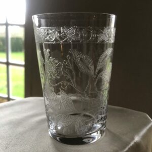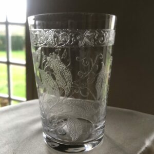 Beau gobelet en cristal chiffré V. Belle gravure à l’acide de fleurs et feuilles. Fin XIX ème – début XXème. Probablement Saint Louis ou Baccarat . Parfait état.