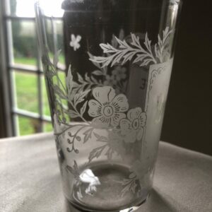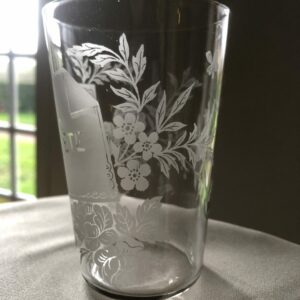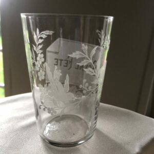 Beau verre en cristal  à décor sablé de fleurs et oiseau entourant une vignette souhaitant une bonne fête.