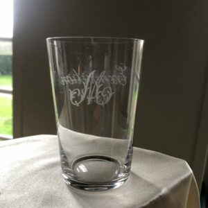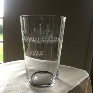 Rare gobelet en cristal chiffré M ,souvenir de l’exposition universelle de Paris en 1878. Gravure à la roue probablement réalisée sur place … et facturée à la ligne d’où l’économie de mots ! Enfin M a du être content(e), et 126 ans plus tard le verre est toujours en parfait état !