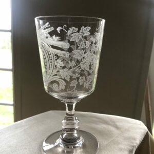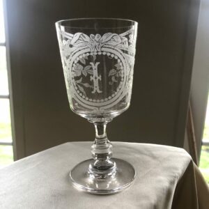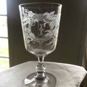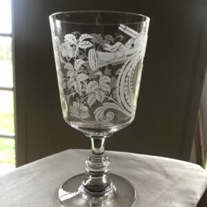 Beau verre sur pied en cristal , décor sablé floral et instruments de musique , chiffré en médaillon de la lettre I .
